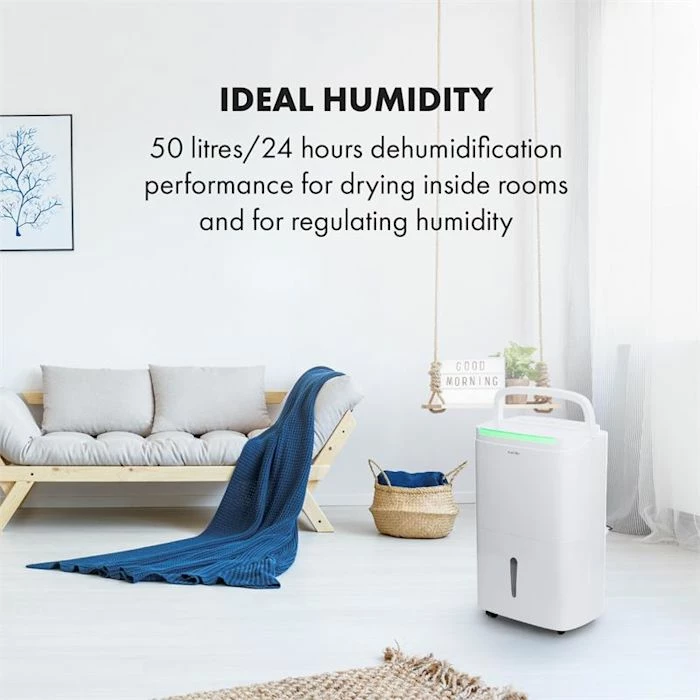 - Pour une humidité idéale : puissance de déshumidification de 50 litres / 24 h pour sécher l’air des pièces intérieures suite aux travaux de construction ou de rénovation ou pour réguler le taux d’humidité dans les cuisines, salles de bain ou chambres à coucher