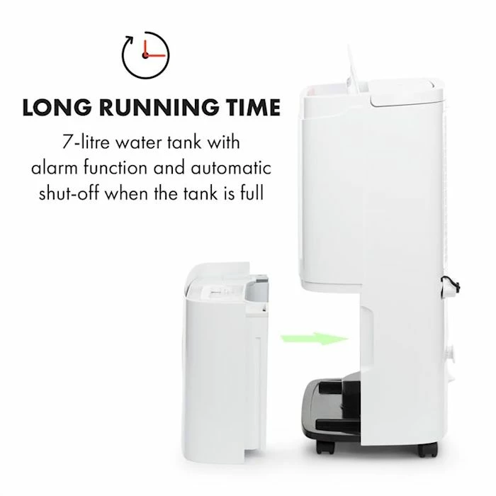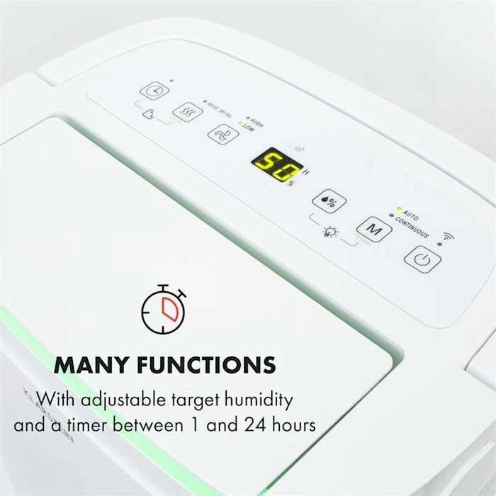 - Humidité-cible programmable par paliers de 5% allant de 30 à 80 pour cent Interface WiFi pour régler facilement via l’application Klarstein