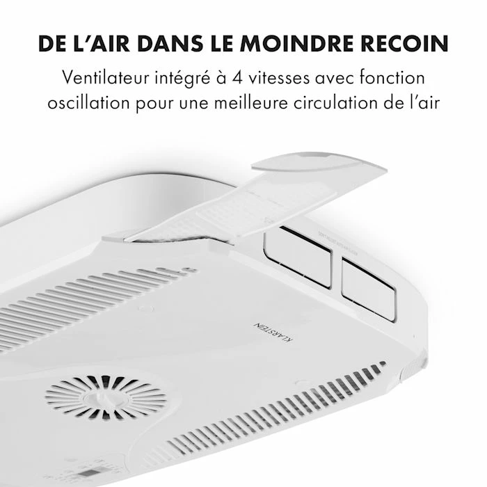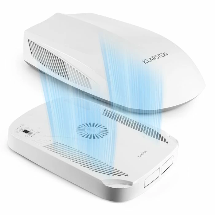Partez la tête froide : le climatiseur pour camping-car Klarstein Klimamobil adoucit le séjour dans la caravane en offrant des températures agréables les jours de froid et de chaleur. Refroidir ou de réchauffer, apporter de l’air frais ou déshumidifier l’air, l’appareil split est équipé pour répondre à tous les besoins et atteindre des températures comprises entre 16 et 30 °C. Il peut également servir de chauffage et de climatisation. Le ventilateur avec oscillation assure alors une circulation agréable de l’air. Le climatiseur réversible Klarstein Klimamobil convient au montage sur des ouvertures de toit de 356 x 356 mm et des toits d’une épaisseur de 30 à 80 mm.