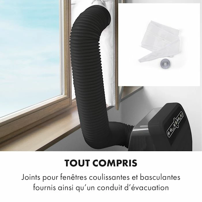 - Complet : avec système d’étanchéité pour les fenêtres coulissantes et basculantes et tuyau d’évacuation d’air