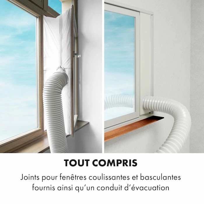 - Complet : avec joint d’étanchéité pour les fenêtres coulissantes et basculantes et tuyau d’évacuation d’air