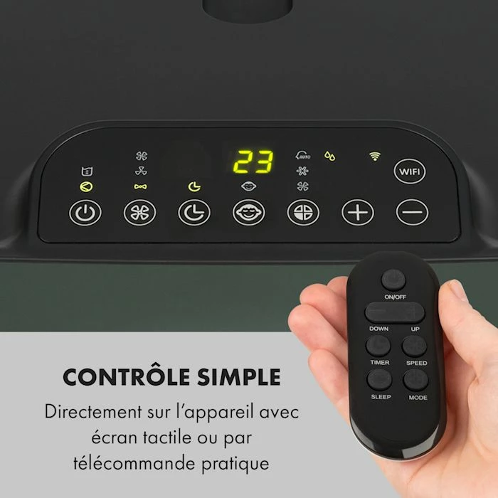 - Contrôle aisé : panneau tactile sur l’appareil, par application et avec télécommande