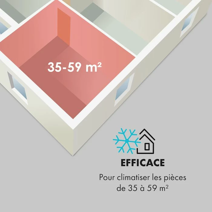 - Puissant : convient pour refroidir des pièces d’une superficie de 35 à 59 m²