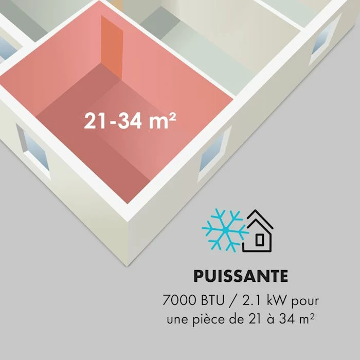 - Puissance de refroidissement : 7 000 BTU / 2,1 kW