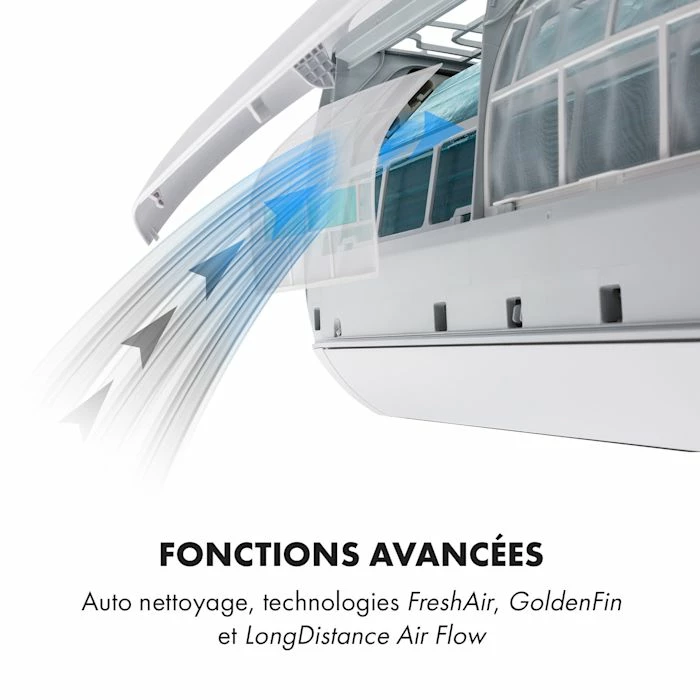 - Fonctions avancées : auto nettoyage, technologie Fresh Air et Golden Fin ainsi que Long Distance Air Flow