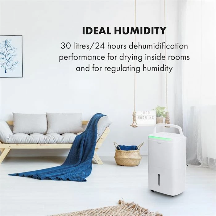 - Pour une humidité idéale : puissance de déshumidification de 30 litres / 24 h pour sécher l’air des pièces intérieures suite aux travaux de construction ou de rénovation ou pour réguler le taux d’humidité dans les cuisines, salles de bain ou chambres à coucher