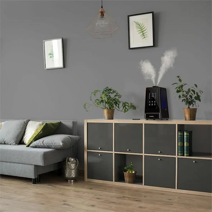 Elégant humidificateur d’air et ionisateur avec diffuseur d’arômes pour humidifier, ioniser et parfumer l’air ambiant dans les bureaux, salons ou chambres à coucher jusqu’à environ 40 m².