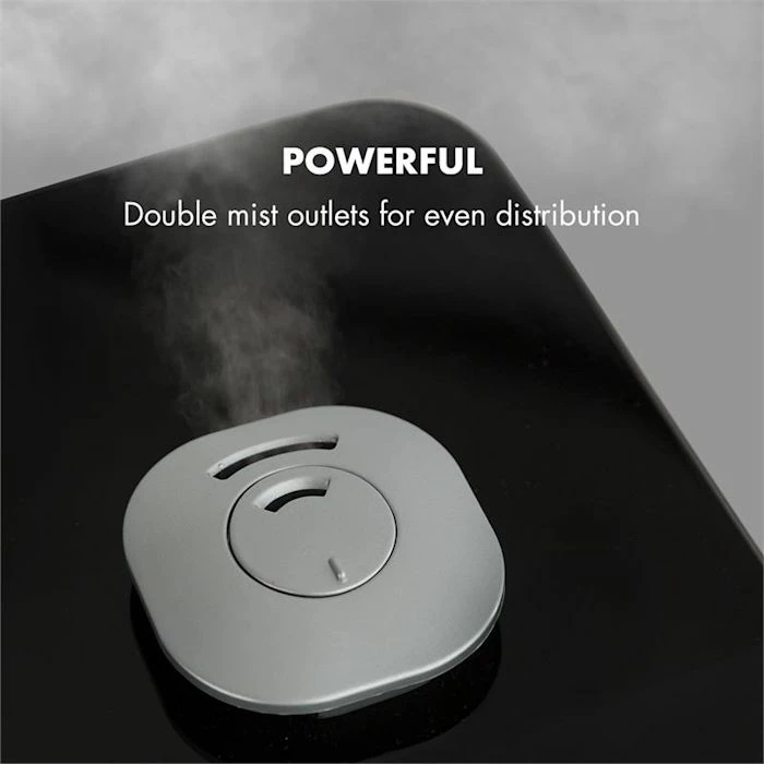 La double sortie de brume assure une diffusion uniforme. Si vous le souhaitez, la fonction Heat peut également être utilisée pour créer une brume chaude. Quatre vitesses de brumisation, diverses fonctions et un mode minuterie garantissent un climat ambiant parfait à tout moment. Le diffuseur d’arôme de l’humidificateur d’air apporte encore plus de détente en donnant à la brume d’eau un parfum de votre choix. Le contrôle est toujours facile et pratique grâce à l’écran tactile et à la télécommande.