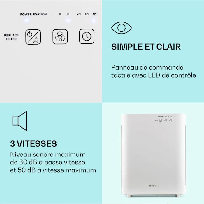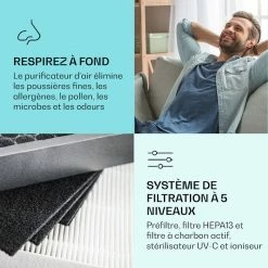 - Système de filtrage à 5 niveaux : pré-filtre, filtre HEPA13 et filtre à charbon actif, stérilisateur UV-C et ionisateur