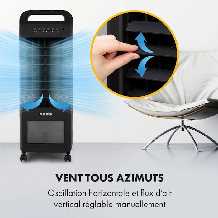 Rafraîchissement maximum ! Le rafraîchisseur d’air 3-en-1 Klarstein Cooler Rush fournit un rafraîchissement précis lors des chaudes journées d’été. À la fois ventilateur, rafraîchisseur et humidificateur d’air, il assure partout un flux d’air rafraîchissant pour garder la tête froide.