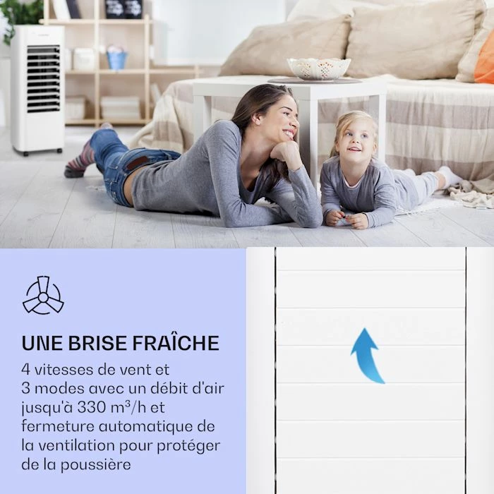 - Brise fraîche : quatre vitesses de vent et trois modes de fonctionnement avec un débit d’air pouvant atteindre 330 m³/h