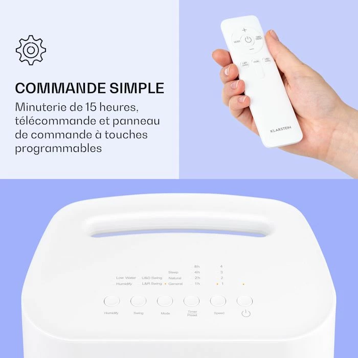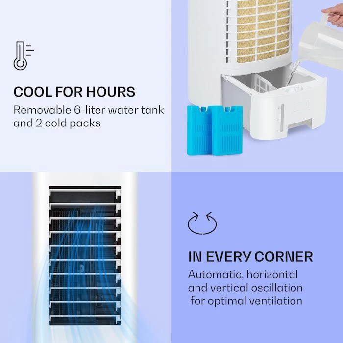 Rafraîchissement par temps chaud : le refroidisseur d’air 3-en-1 IceWind Max de Klarstein te fournit en toute fiabilité un flux d’air frais et convainc également par temps froid grâce à ses fonctions pratiques d’humidificateur d’air. Grâce à l’oscillation automatique, horizontale et verticale, aux 4 vitesses et aux 3 modes de vent, tu garderas toujours la tête froide. Le flux d’air est agréablement rafraîchi par l’évaporation du réservoir d’eau de 6 litres. Cela permet de te rafraîchir lors des journées chaudes, que tu sois au bureau, sur le canapé ou en train de jouer avec les enfants. Et en hiver, tui peux directement humidifier l’air pour respirer librement.