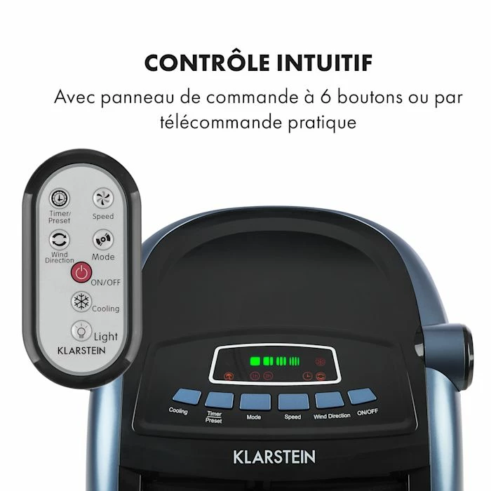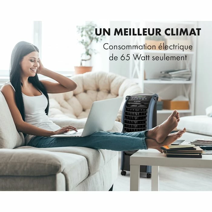 Rafraîchissement maximal ! Le rafraîchisseur d’air 4 en 1 Maxfresh Ocean de Klarstein apporte une fraîcheur qui tombe à point pour les chaudes journées d’été. A la fois ventilateur, rafraîchisseur d’air et humidificateur, il assure partout un flux d’air rafraîchissant – grâce au mode Nuit, il facilite en outre votre sommeil pendant les chaudes nuits d’été. Sa particularité : un mode naturel raffiné simule le vent réel montant et descendant. Quatre vitesses de vent permettent un rafraîchissement personnalisé. Le mode nuit diminue lentement le refroidissement jusqu’à l’arrêt de l’appareil et la fonction rafraîchisseur d’air humidifie encore plus l’air ambiant grâce à l’évaporation de l’eau. Pour plus de fraîcheur, refroidissez l’eau du réservoir de 6 litres avec des accumulateurs de froid. Pour faciliter le remplissage, le nettoyage et la vidange, le réservoir d’eau est entièrement amovible.