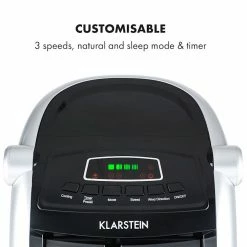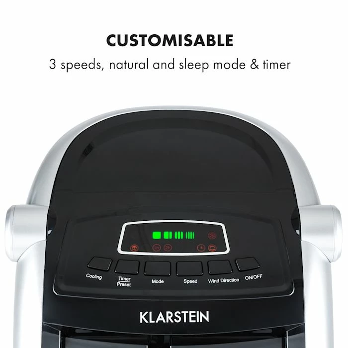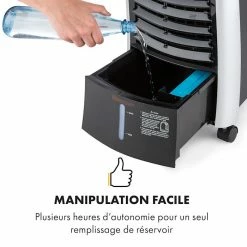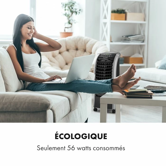 Rafraîchissement maximal avec 55 watts d’économie ! Le rafraîchisseur d’air 4 en 1 Maxfresh de Klarstein apporte un rafraîchissement ponctuel lors des chaudes journées d’été. A la fois ventilateur, refroidisseur d’air et humidificateur, il assure partout un flux d’air rafraîchissant et une tête fraîche – grâce au mode Nuit, il facilite en outre ton sommeil pendant les chaudes nuits d’été. La minuterie d’arrêt confortable, que vous pouvez préprogrammer jusqu’à 15 heures par heure, est particulièrement convaincante.