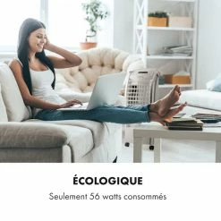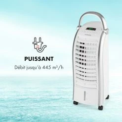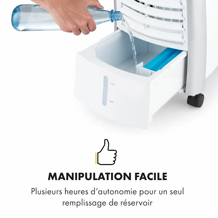 Rafraîchissement maximal avec 55 watts d’économie ! Le rafraîchisseur d’air 4 en 1 Maxfresh de Klarstein apporte un rafraîchissement ponctuel lors des chaudes journées d’été. A la fois ventilateur, refroidisseur d’air et humidificateur, il assure partout un flux d’air rafraîchissant et une tête fraîche – grâce au mode Nuit, il facilite en outre ton sommeil pendant les chaudes nuits d’été. La minuterie d’arrêt confortable, que vous pouvez préprogrammer jusqu’à 15 heures par heure, est particulièrement convaincante.