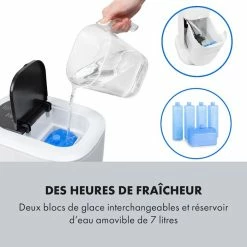 - Des heures de fraîcheur : cinq packs de glace remplaçables et réservoir d’eau remplissable par le haut de 7 litres