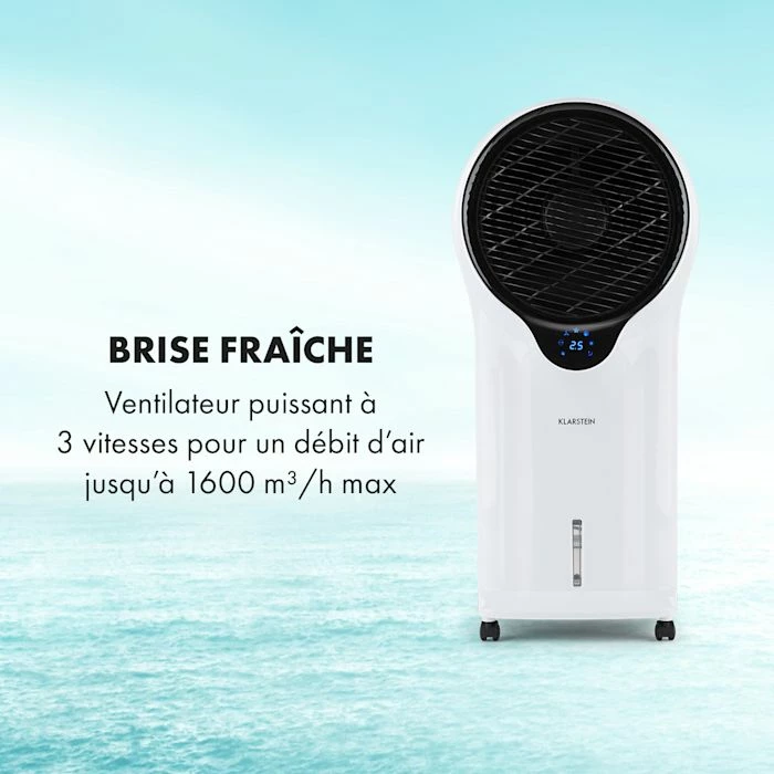 Comme une brise marine fraîche : le rafraîchisseur d’air 3 en 1 Klarstein Whirlwind assure un flux d’air clair et rafraîchi lors des chaudes journées d’été. Avec le ventilateur, le rafraîchisseur d’air et l’humidificateur, on se rafraîchit avec précision, que ce soit au bureau, sur le canapé, en cuisinant ou en jouant avec les enfants. Trois vitesses avec un brassage d’air allant jusqu’à 1600 m³ à l’heure mettent l’air paresseux de l’été en ébullition. L’oscillation activable permet à plus d’une personne de profiter du flux d’air. De plus, le Whirlwind dispose de trois modes de fonctionnement différents, comme le mode Nature, dans lequel le flux d’air gonfle et dégonfle de manière similaire au vent naturel. Pour un rafraîchissement maximal, le Klarstein Whirlwind dispose en outre d’un rafraîchisseur d’air activable, qui lutte contre l’air sec du chauffage, même en hiver. L’air aspiré est refroidi par évaporation dans un réservoir d’eau de 5,5 litres et est en plus humidifié.