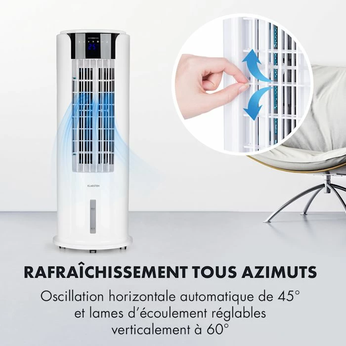 L’expert de la fraîcheur à volonté : le climatiseur 4 en 1 Skyscraper Horizon de Klarstein ne se contente pas de distribuer de l’air frais, il le refroidit et l’humidifie également. Vous pouvez ici choisir librement parmi trois modes agréables et adapter le flux d’air à trois vitesses différentes. Une brise fraîche souffle alors dans votre salon, votre bureau ou votre chambre à coucher avec un débit d’air allant jusqu’à 486 m³/h. L’installation à 45° commutable et les lamelles orientables verticalement à 60° sont astucieuses et permettent à une brise fraîche d’atteindre tous les recoins et de se répartir de manière optimale dans toute la pièce. Grâce au mode Sommeil avec minuterie d’arrêt automatique et un très faible bruit de fonctionnement, le climatiseur Skyscraper Horizon de Klarstein peut t’accompagner en douceur dans le sommeil de la nuit d’été. Grâce au réservoir d’eau de 3,5 litres, la fonction de refroidissement de l’air est atteinte, ce qui permet d’alimenter le flux d’air en eau fraîche et d’humidifier ainsi agréablement l’air ambiant.