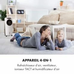 - Appareil 4-en-1 : rafraîchisseur d’air, ventilateur, ioniseur TACT et humidificateur d’air