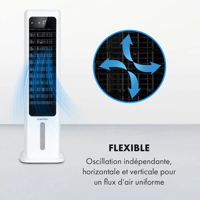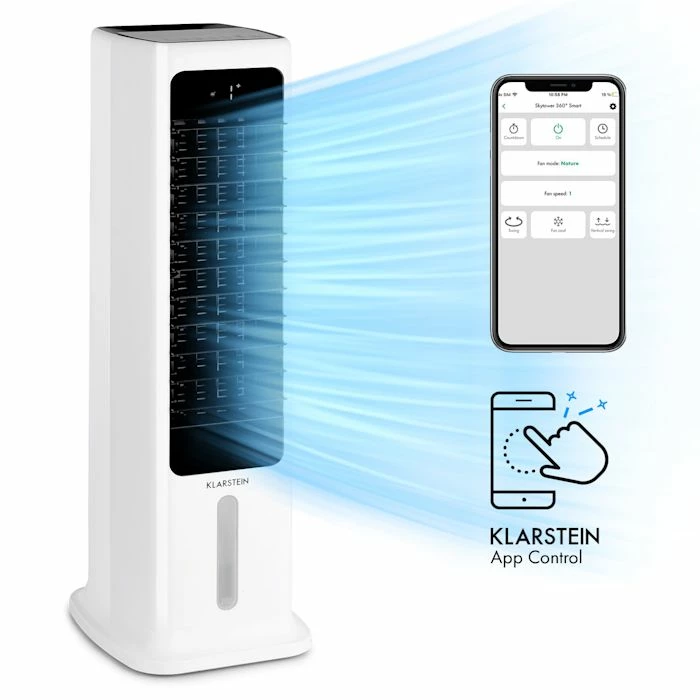 Le refroidisseur d’air 4-en-1 Klarstein Skytower 360° Smart avec fonction Wifi intégrée et contrôle via application diffuse précisément de la fraîcheur avec son oscillation automatique verticale et horizontale et ses 4 roulettes.