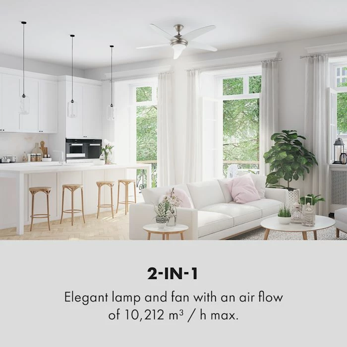 - 2-en-1: lampe et ventilateur au design élégant avec un débit d’air maximal de 10 212 m³/h.