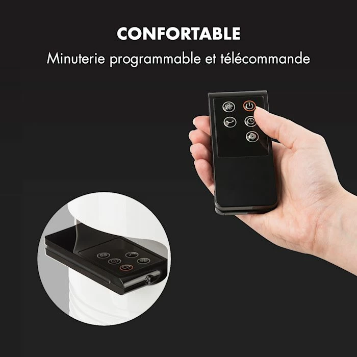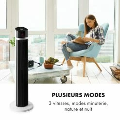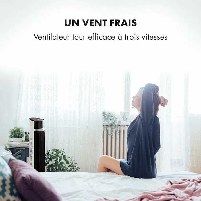 - Brise fraîche : ventilateur tour efficace avec trois vitesses et un débit d’air de 438 m³/h max.