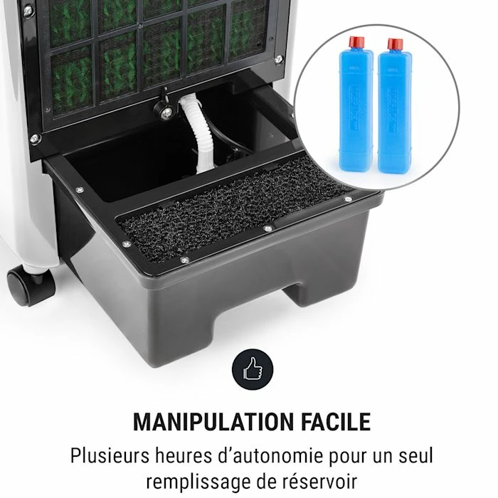 - Des heures de fraîcheur : deux blocs réfrigérants remplaçables et un réservoir d’eau de 4 litres